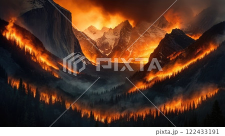 Aerial view of intense devastating raging forest fire. Burned pine forest at wildfire. Intense smoke. Hills, mountains, blue sky. Caused by summer heat wave and drought due to climate change.
