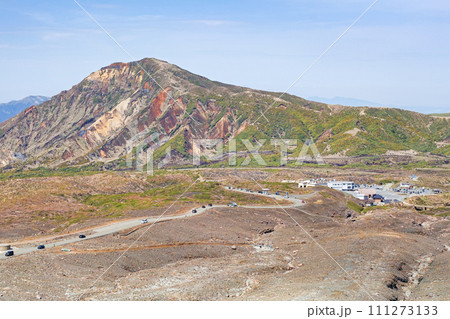 熊本県/ 阿蘇中岳第一火口付近からみる公園道路・草千里(草千里ヶ浜)側方面
