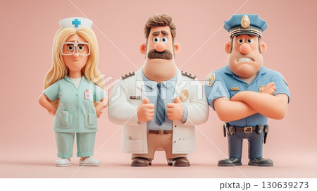 Cartoon Characters Representing Nurse, Doctor, and Police Officer in Uniforms