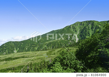 夏の立山、バスの車窓から弥陀ヶ原、鍬崎山方面を望む