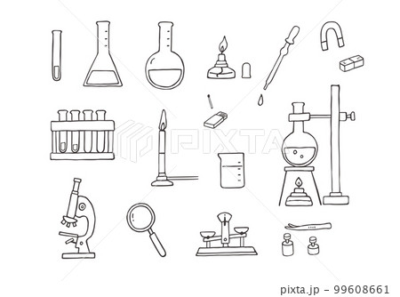 理科の実験にまつわる手描きイラストセット(モノクロ)