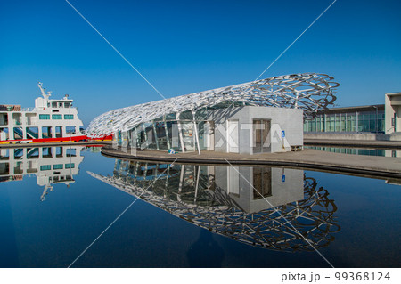 青空の下、サンポート高松の岸壁から望む瀬戸内海と離合するフェリー