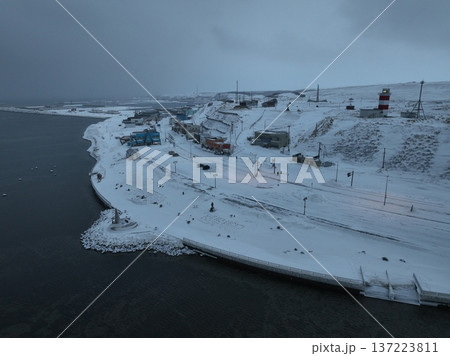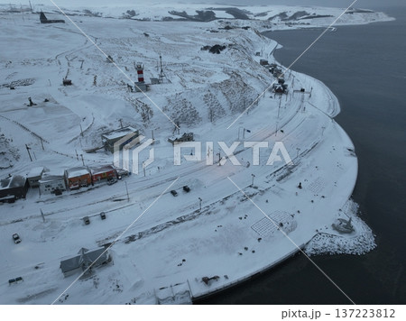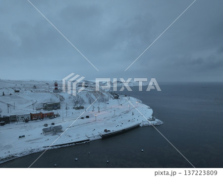 雪降る早朝の宗谷岬空撮と灯台点灯