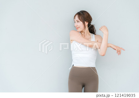 ストレッチ・深呼吸・リフレッシュするヨガウェア・スポーツウェアを着た女性
