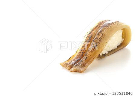 お皿の上に盛り付けられた炙り煮穴子の一本握り(白背景)