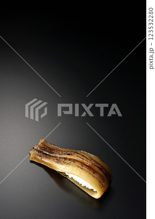 お皿の上に盛り付けられた炙り煮穴子の一本握り(黒背景)