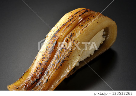 お皿の上に盛り付けられた炙り煮穴子の一本握り(白背景)