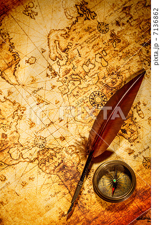 Vintage compass and goose quill pen lying on an old map.