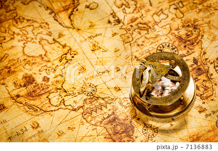 Vintage compass lies on an ancient world map.