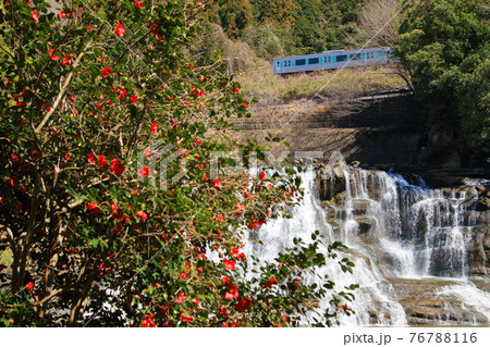 龍門の滝 椿と滝と列車 烏山線滝駅