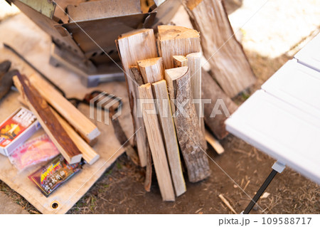 調理用の薪 まきとカマド アウトドア キャンプ場 炊事場 イメージ素材