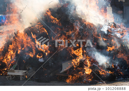 お焚き上げの炎 古い正月飾りや縁起物がお清めの炎で炭と灰になる