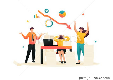 Stressful situation of falling stock prices, the company's employees in a panic. Flat 2D character. Concept for web design