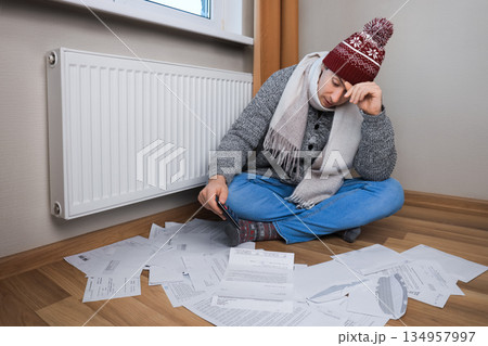 Stressed man in winter hat sitting on floor with calculator and bills near radiator, worried about high heating costs. High quality photo