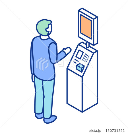 キオスクの筐体の前に立ち、操作する人物のアイソメトリックイラスト。セルフレジでの決済。自動チェックイ