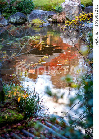 妙心寺・退蔵院の秋、余香苑の池の水面に映った紅葉の秋色