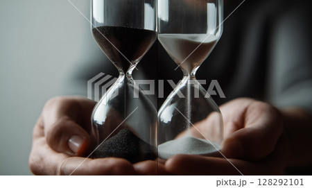 手に持つ2つの砂時計の比較、時間切れの象徴