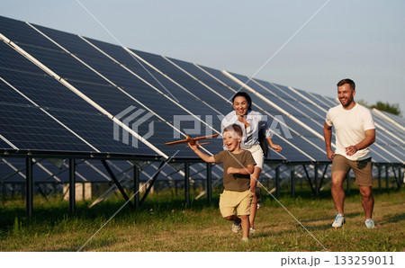 Active, running with toy plane. Father, mother and little son are outdoors near solar panels
