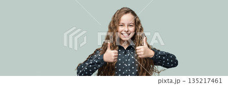 Happy caucasian young girl with long curly hair giving thumbs up in a starry