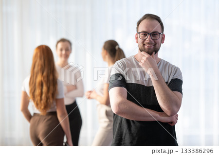 Portrait of a confident young man wearing glasses and smiling while standing with his colleagues in the background during an informal business meeting.