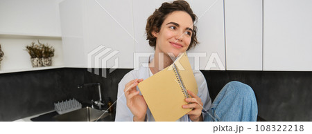 Portrait of woman writing down her thoughts in diary, planner or journal, holding notebook on her laps, sitting on floor in kitchen and studying