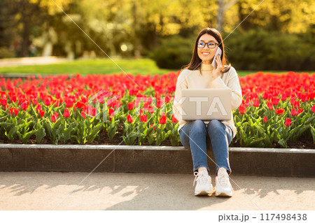 A young Asian woman with glasses is sitting on the edge of a flowerbed filled with blooming tulips while using her laptop. She appears focused and is enjoying the sunny afternoon in the park.