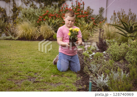 Child kneeling on lawn beside edged flower bed, planting yellow flowers among succulents in garden