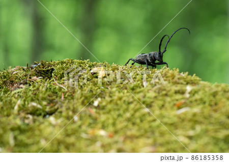 Morimus funereus, longhorn beetle in its natural habitat on a moss-covered log in a green spring forest - selective focus, space for text