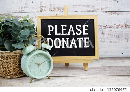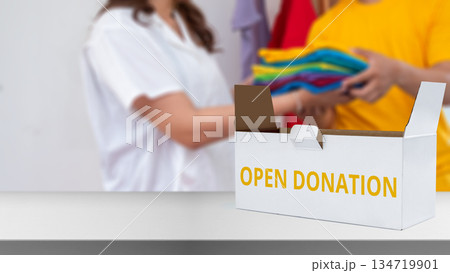 White box labeled "OPEN DONATION" sitting on a white table with people in the background donating colorful clothes. Charitable activities, volunteering, and donation drives