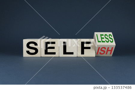 Cubes form the words Selfless or Selfish. Behavior and lifestyle concept