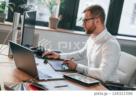 Side view. Man in formal clothes is working in the modern office. Using computer