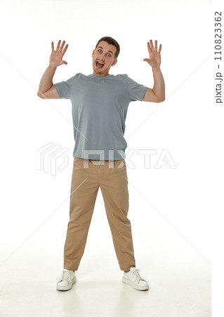 surprised guy looking at camera on white studio background
