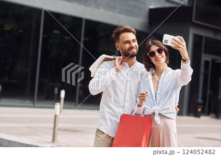 Making selfie. Beautiful couple have a shopping day outdoors at daytime