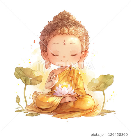 Smiling child Buddha sitting in lotus position surrounded by flowers in serene setting