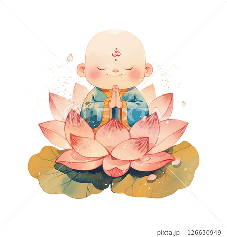 Young monk in meditation on a lotus flower surrounded by soft colors and tranquility