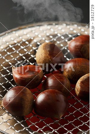 炭火で焼く 焼き栗 (黒背景) 木の実 イガグリ 栗の実 クリ やきぐり やき栗