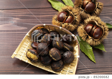 ざるに盛った焼き栗_背景ぼかし