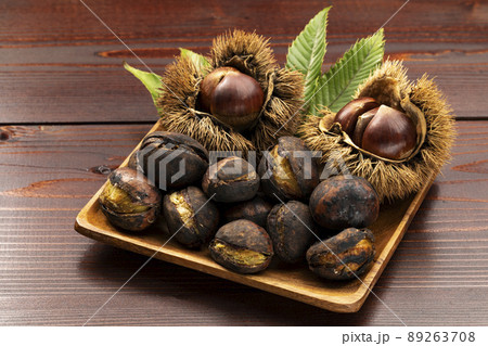 秋の味覚 焼き栗 (黒背景) 木の実 イガグリ 栗の実 クリ やきぐり やき栗