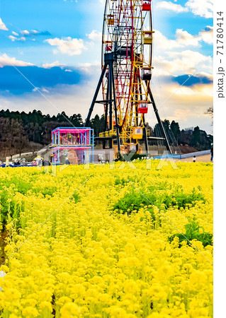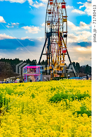 千葉県袖ケ浦市にあるテーマパーク東京ドイツ村で見た夕暮れ時の菜の花と観覧車