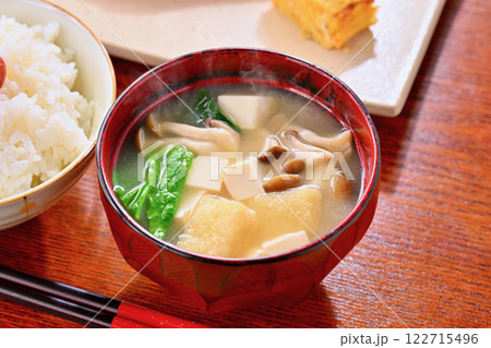 注)湯気は合成です。和食のイメージ。白ご飯、具だくさんお味噌汁、焼き鮭、玉子焼、ほうれん草炒め。
