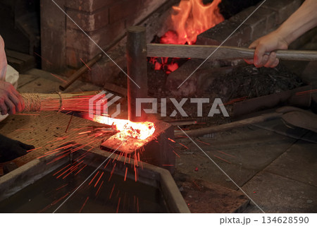 伝統技術で赤熱した鉄を鍛える日本の鍛冶職人