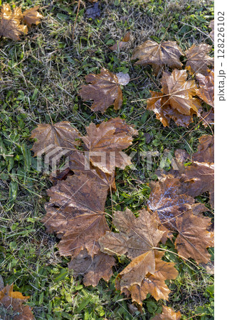 maple leaves covered with condensation on the grass in the morning, maple leaves fallen to the ground during the autumn fall, close up