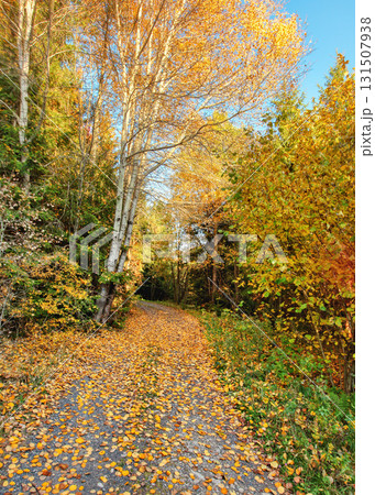 Dust and rock forest road, autumn coloured trees on both sides, clear sky in background
