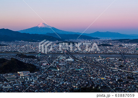 静岡市駿河区朝鮮岩から夕方の紅富士と静岡市街の夕景