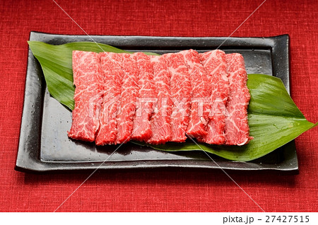 焼肉、国産牛「サガリ(部位)」肉。焼肉店、韓国料理店イメージ。牛肉・ビーフ、焼き肉料理。