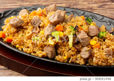 注意)湯気はレタッチ合成です。炒飯(チャーハン)イメージ。ぱぱ〜ん手作りのパラパラ炒飯です。具材は、