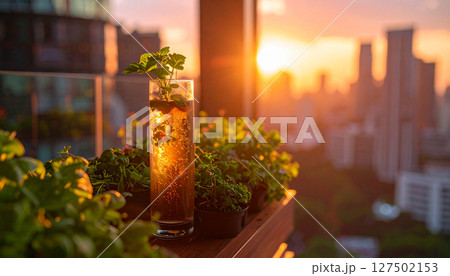 Vertical farm skyscraper with edible window gardens growing cocktail ingredients. Generated Image