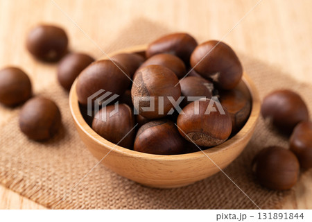 Roasted chestnuts in wooden bowl on brown background, Japanese chestnuts