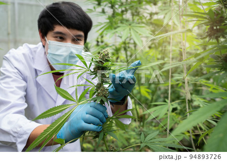 Scientist check Cannabis or Marijuana or hemp leaf in a greenhouse. weed, herbal alternative medicine, cbd oil, pharmaceutical industry Concept