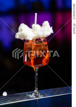 A vibrant orange cocktail filled with ice sits on a textured bar, topped with a whimsical cloud of white cotton candy and a white straw.
